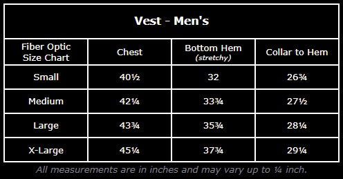 The battery pack also comes with an included USB Cable for charging, charge it on your computer, or with a phone charger! This vest has Red, Green, Blue, and White and all of the colors in between. You can choose to strobe, flash, fade, or have a nice smooth transition between the colors! You can also choose you favorite solid lit color and leave it!